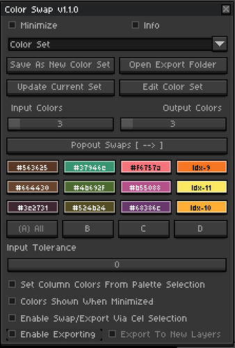 A set of color swaps can be saved by creating a color set. This set will contain all input and output colors and can be selected in the dropdown at the top of the tool.